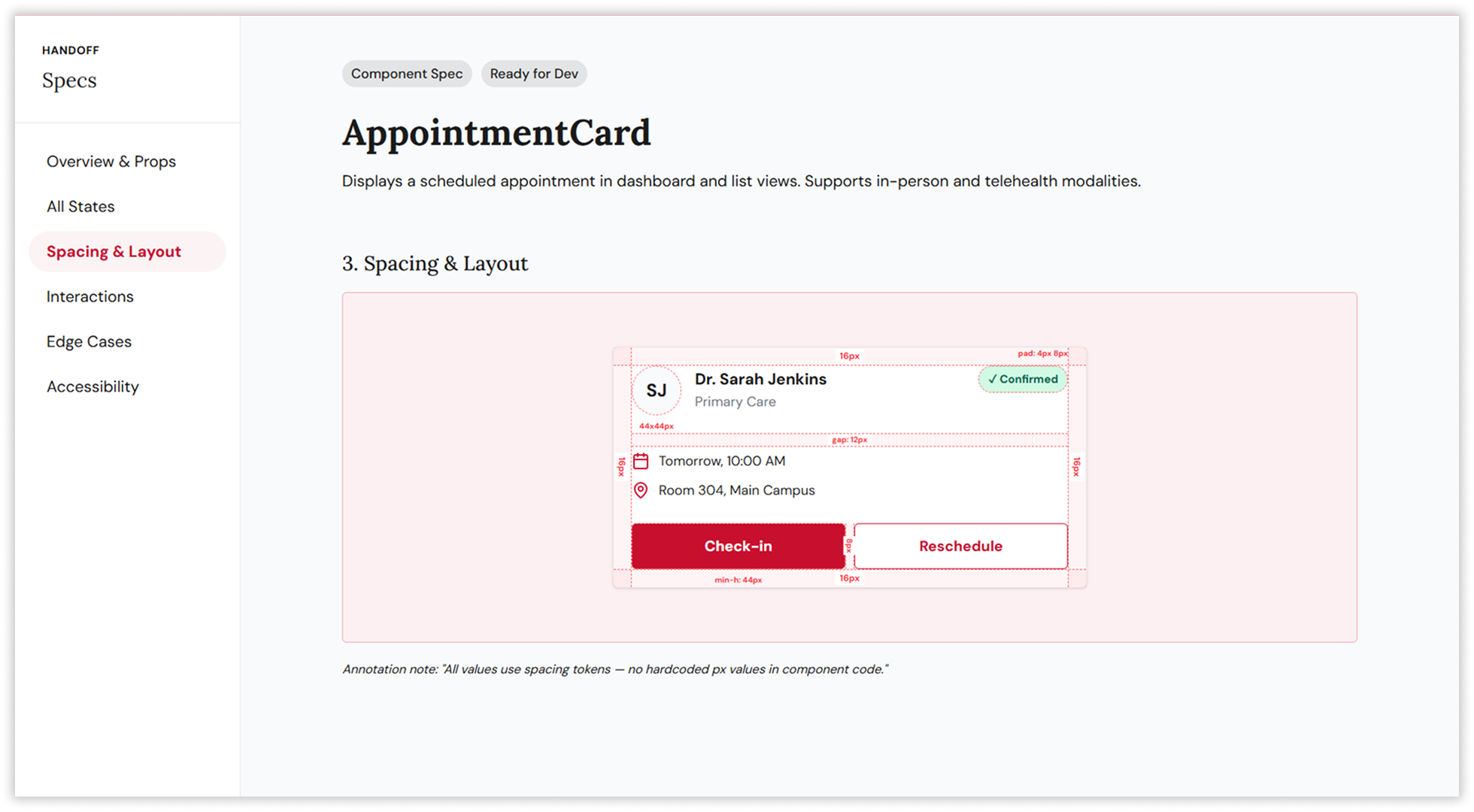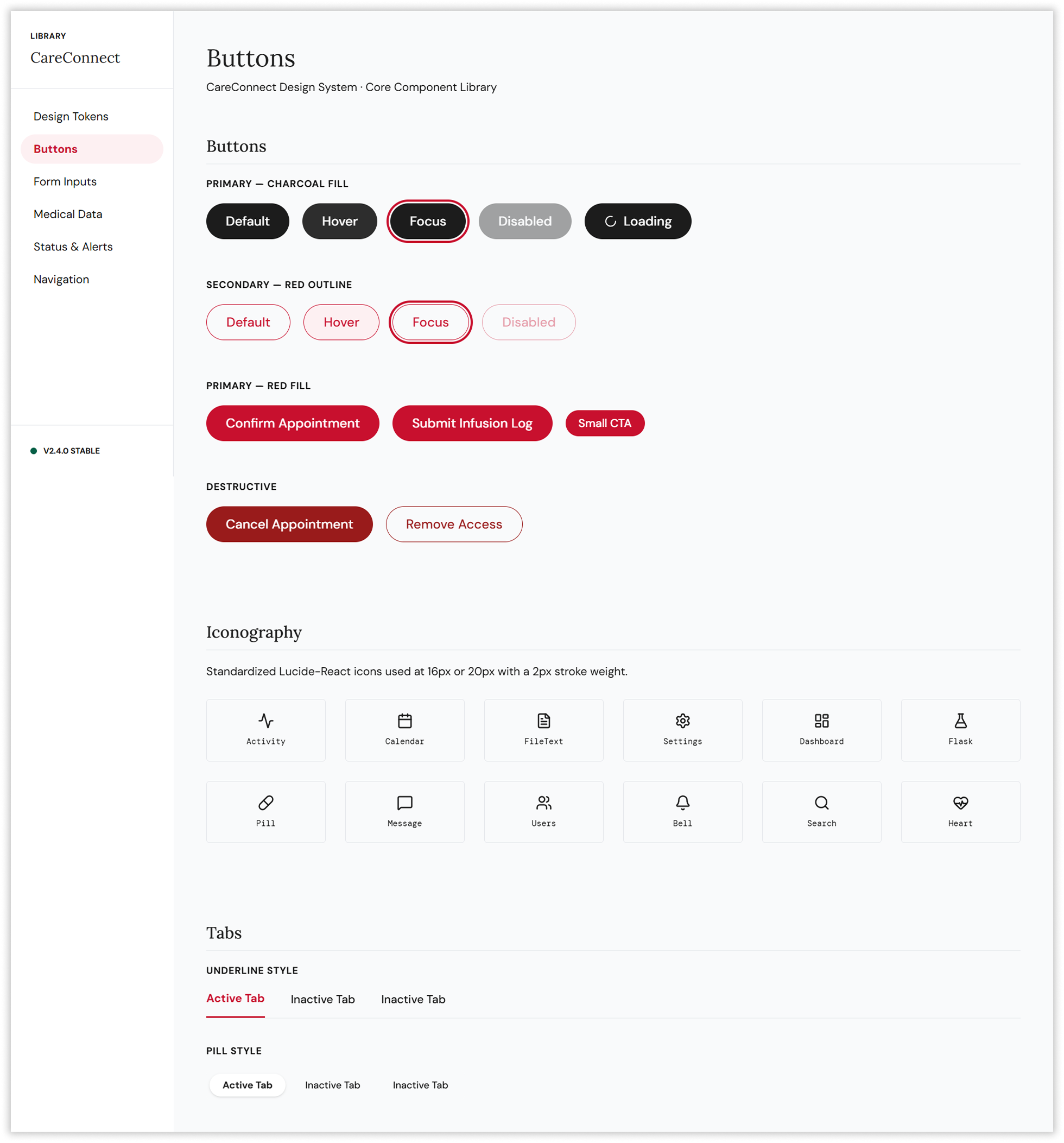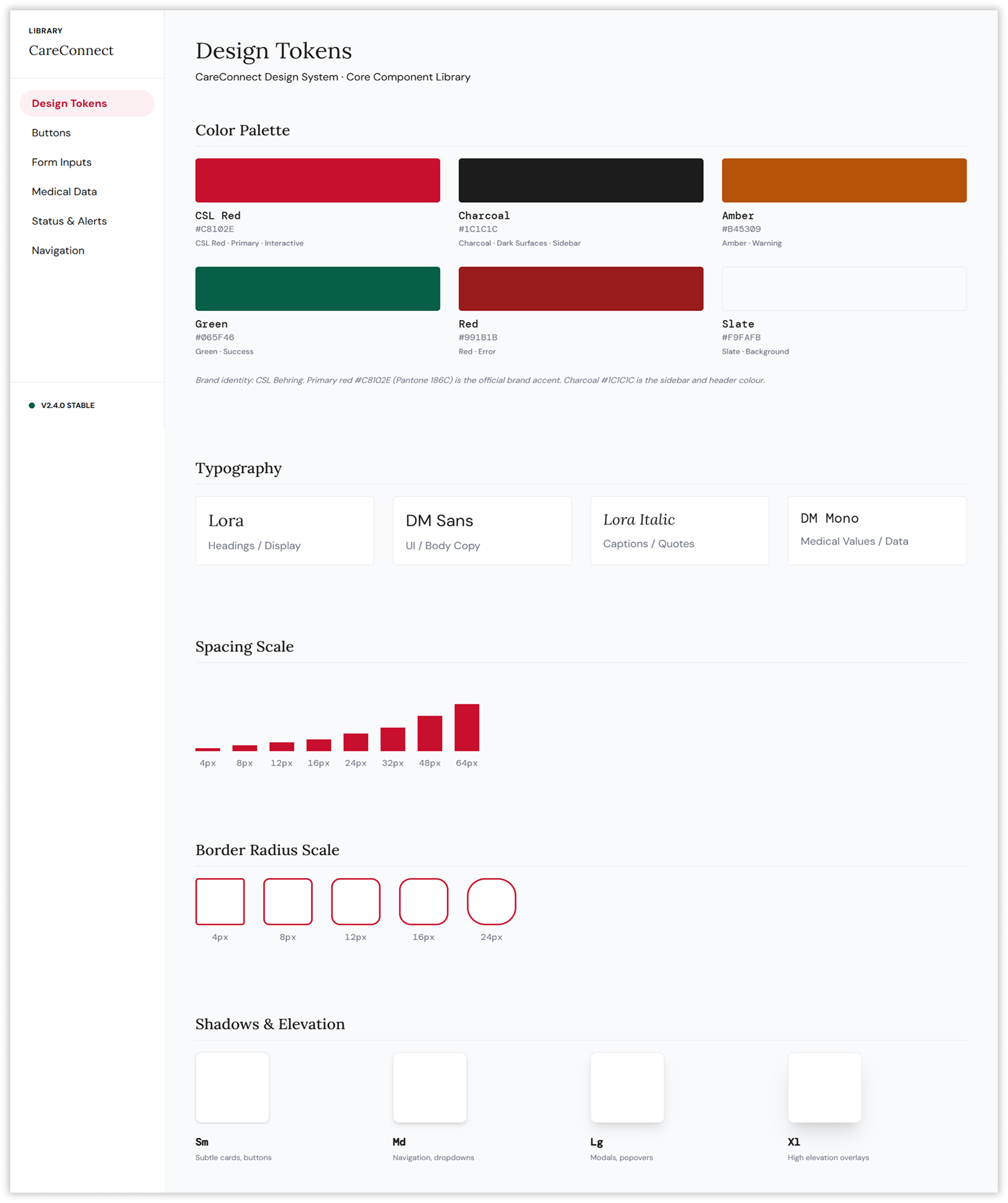 Rather than designing individual screens in isolation, the strategy prioritised building a scalable design system first — 180+ components across six categories, underpinned by a JSON-based design token architecture operating across three tiers: primitive, semantic, and component. This three-tier hierarchy enabled white-label customisation across six global markets (CareConnect US, EuroHealth EU, APACare APAC, and three additional regional variants) from a single codebase, ensuring that a button’s background colour could be updated globally by changing a single token value, not hunting through hundreds of component files.