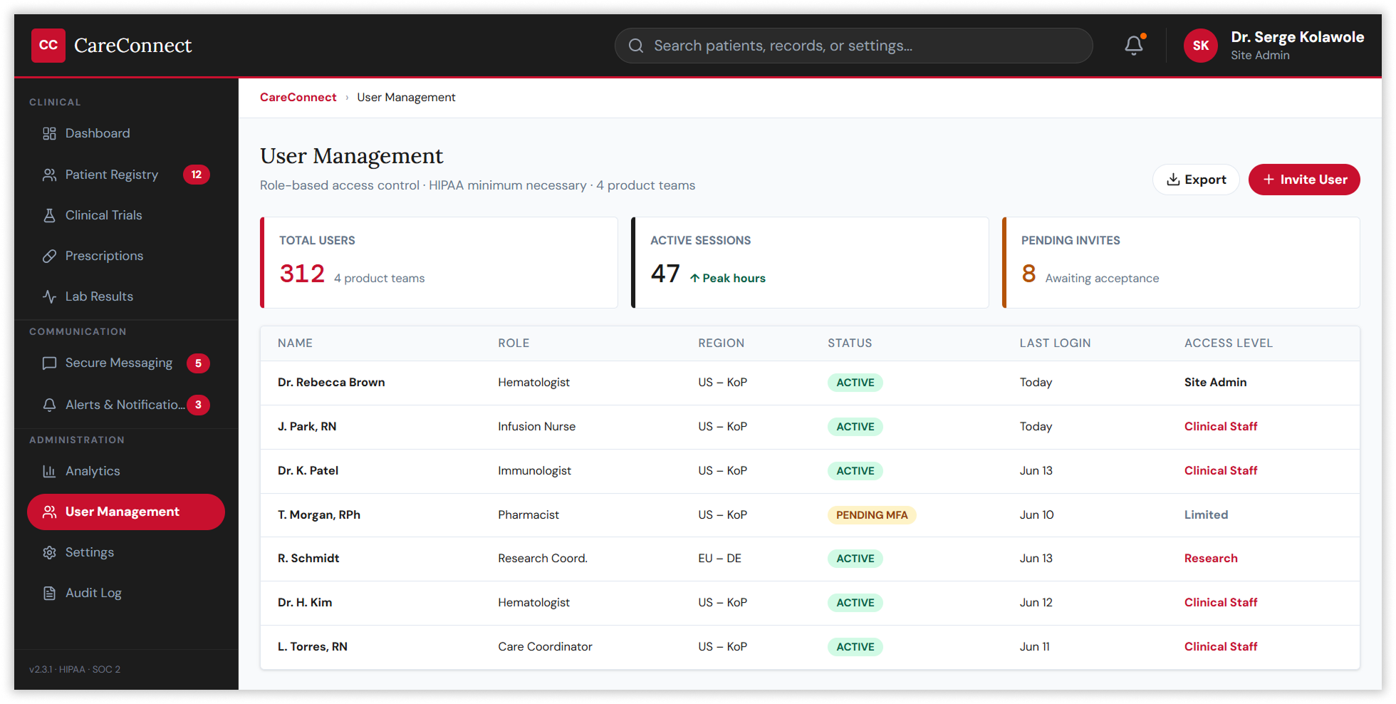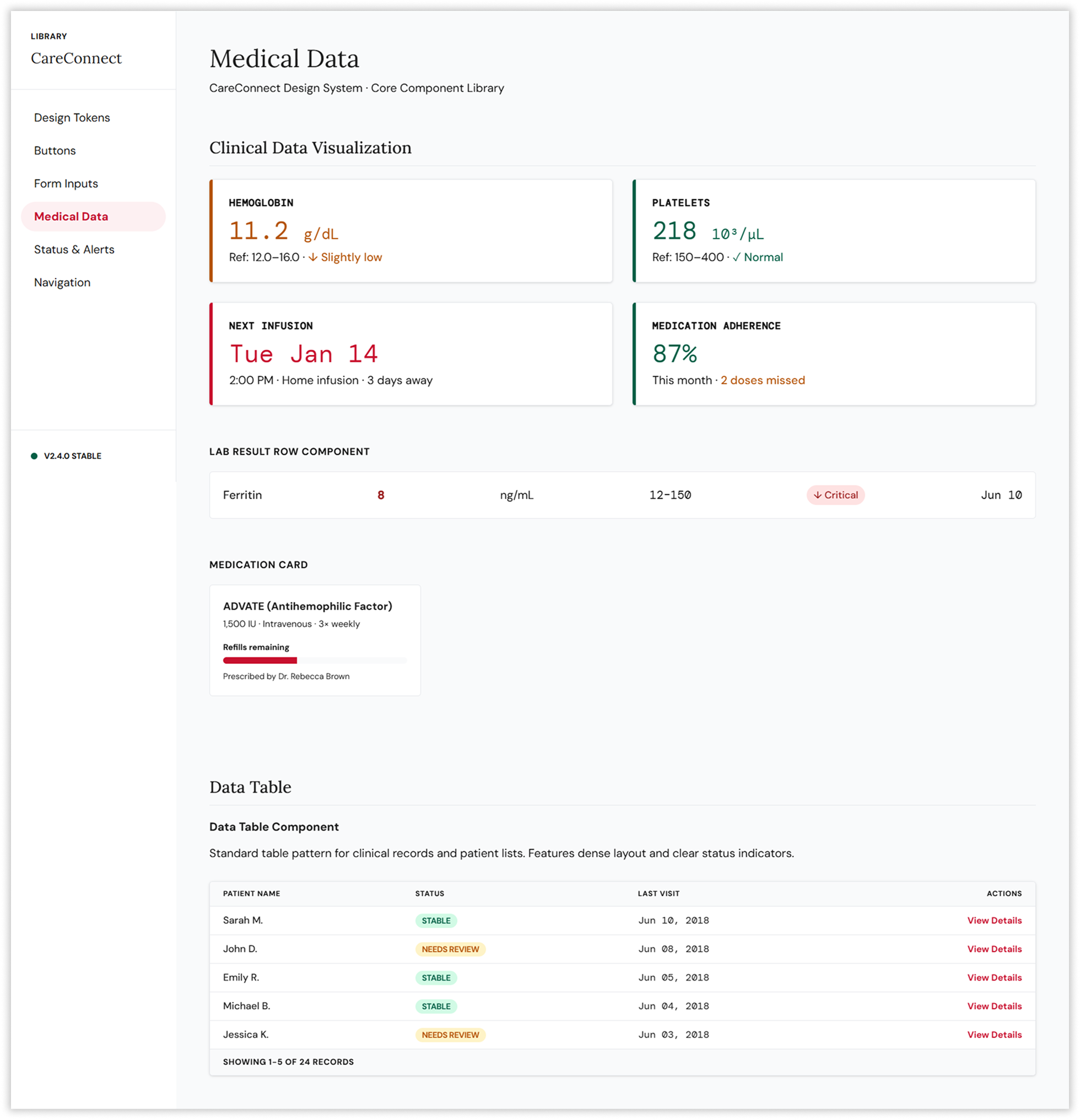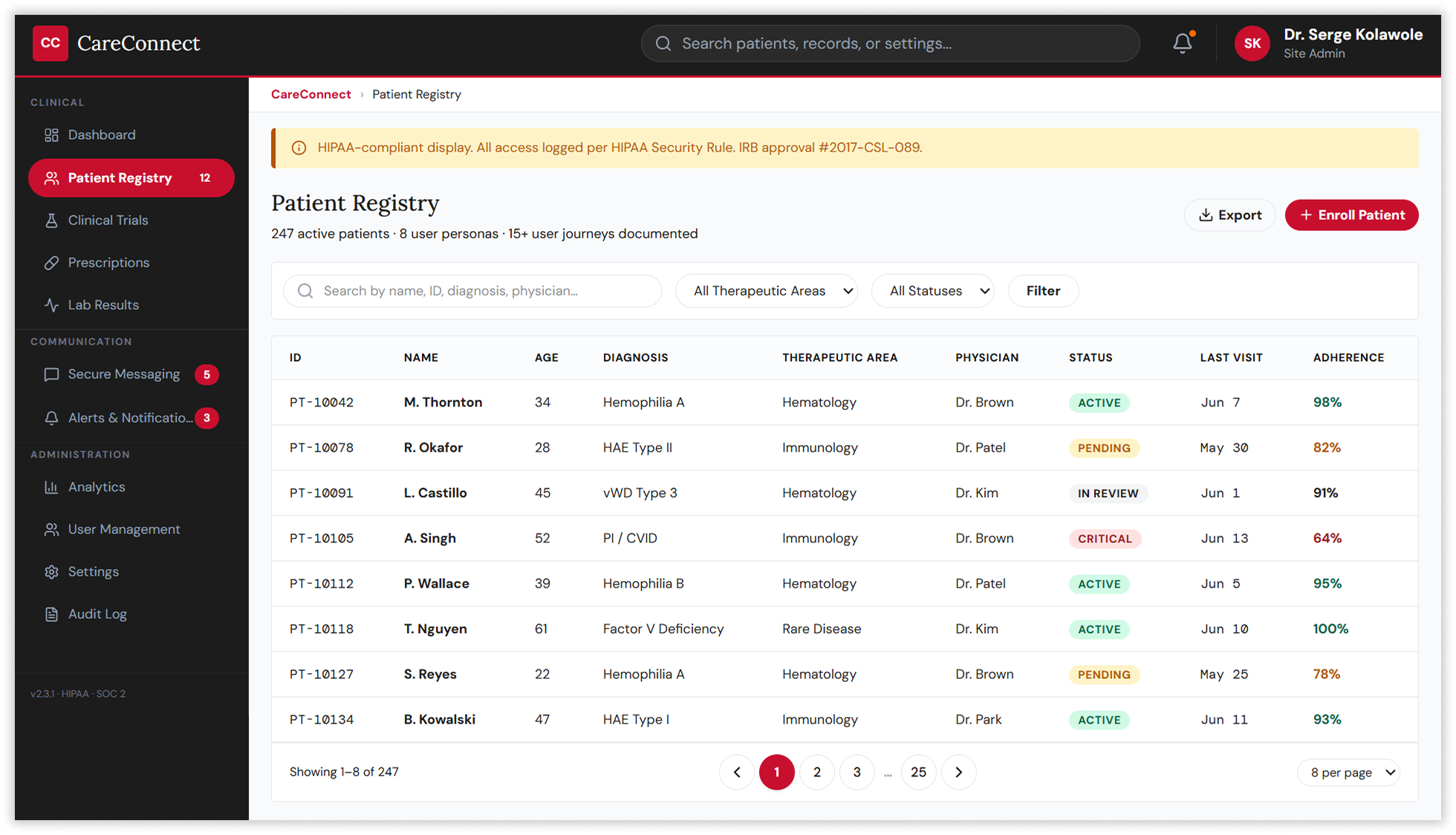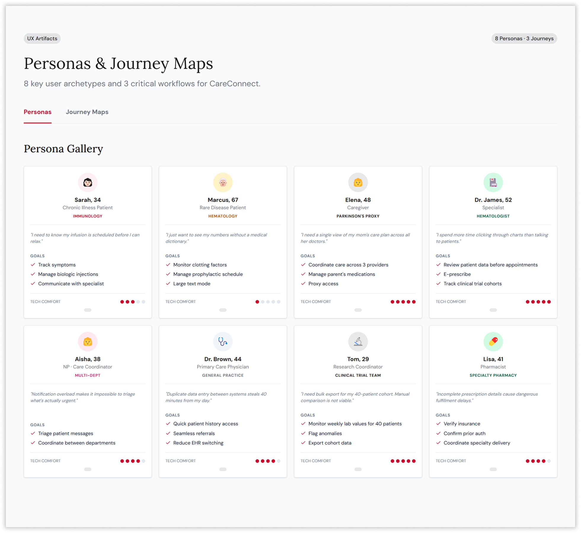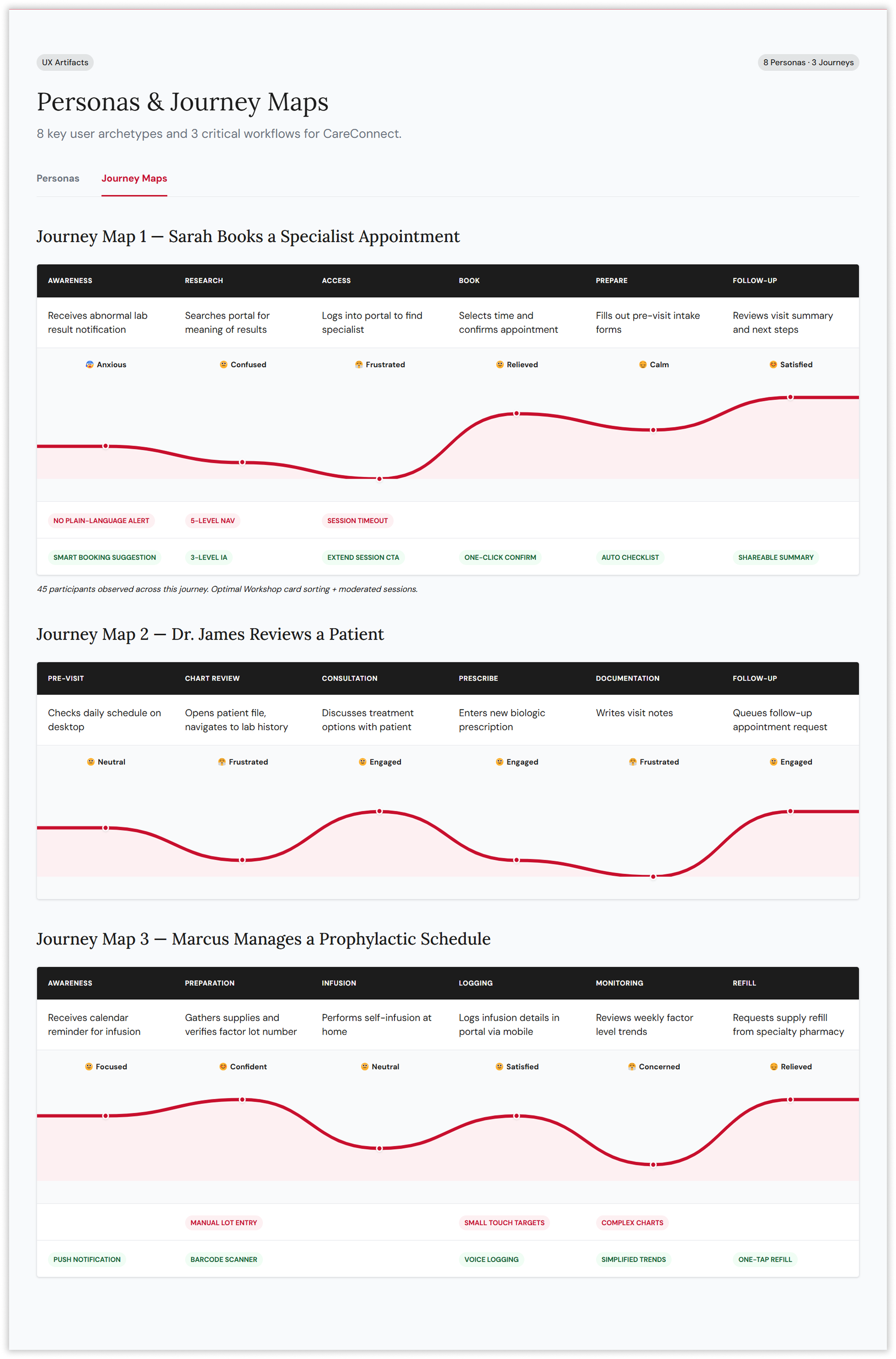 The platform needed to serve two radically different user types simultaneously. On one side: patients like Marcus, a 67-year-old with rare haemophilia who accesses the portal monthly and struggles with medical jargon; and Sarah, a 34-year-old managing biologic injections who needs to know her infusion is confirmed before she can relax. On the other: Dr. James, a hematologist who reviews patient data multiple times daily and cannot afford to spend more time clicking through charts than talking to patients. These eight distinct personas — across patients, caregivers, specialists, nurses, pharmacists, and research coordinators — shared a single platform and demanded coherent design thinking across all of them.