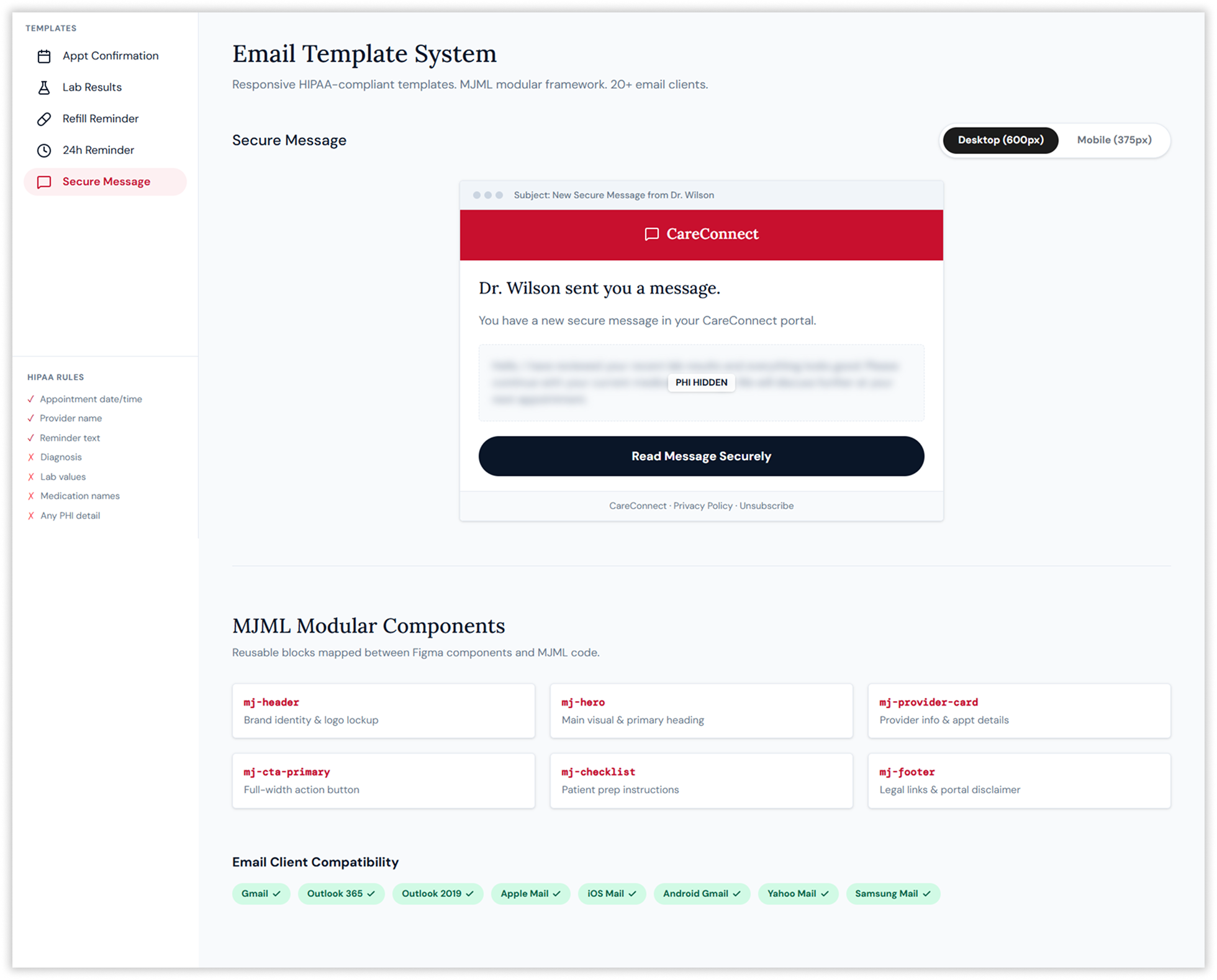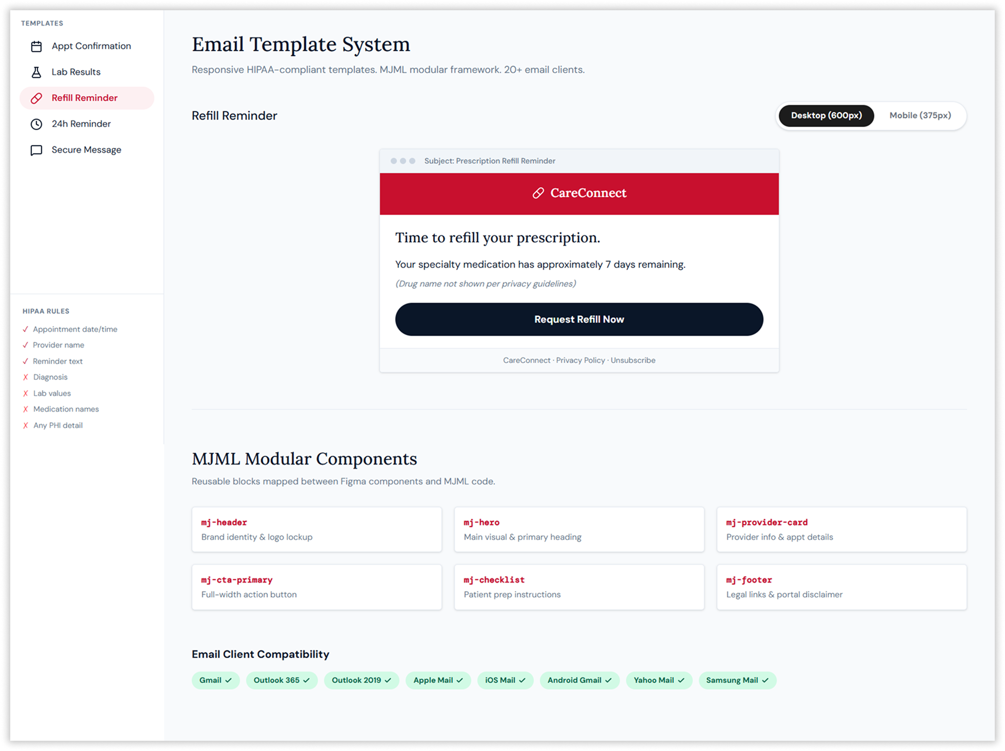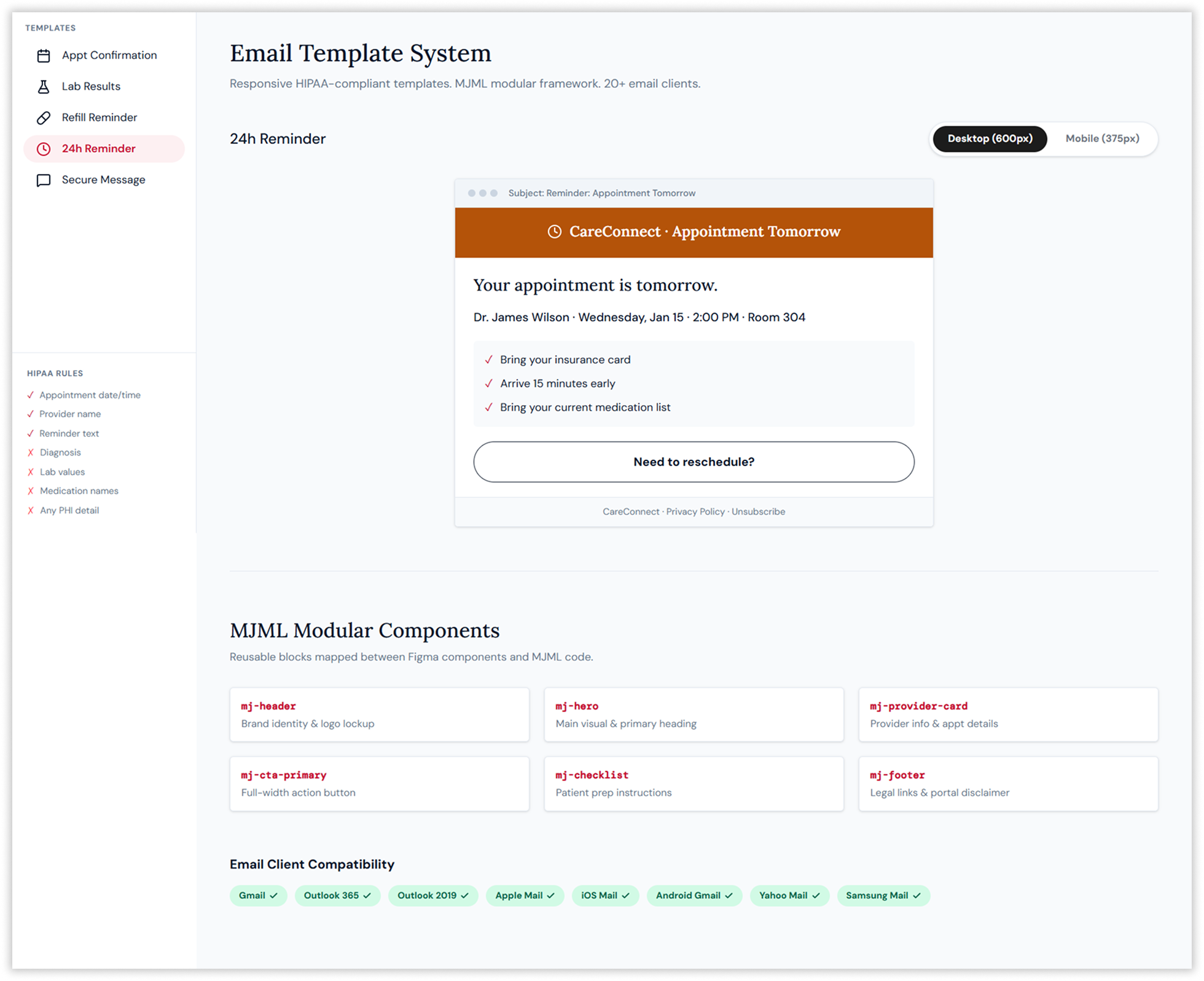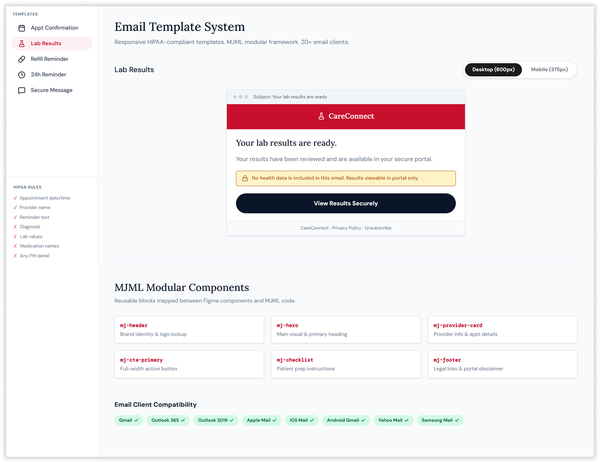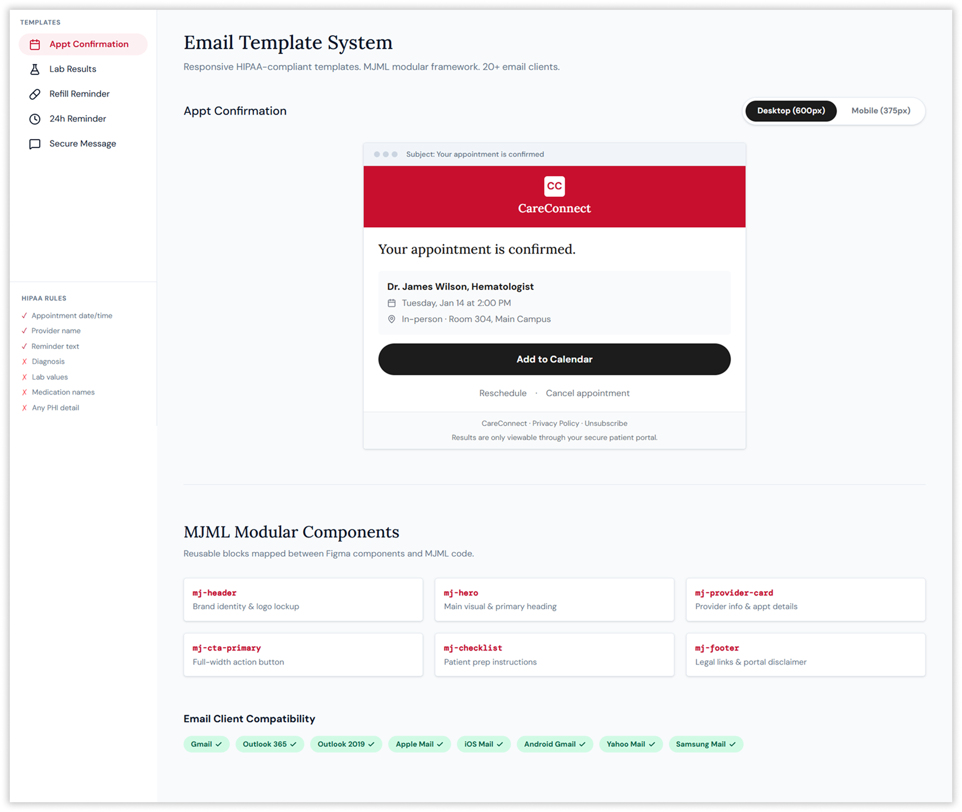 At the system level, the design token architecture and scalable component library enabled the platform to launch simultaneously across six global markets with full white-label customisation capability, supporting four product teams without requiring individual design intervention for each regional variant. The MJML email template system, tested against more than 20 email clients, delivered consistent rendering across Gmail, Outlook, Apple Mail, and eight additional clients while maintaining strict HIPAA compliance — never including PHI in email content.