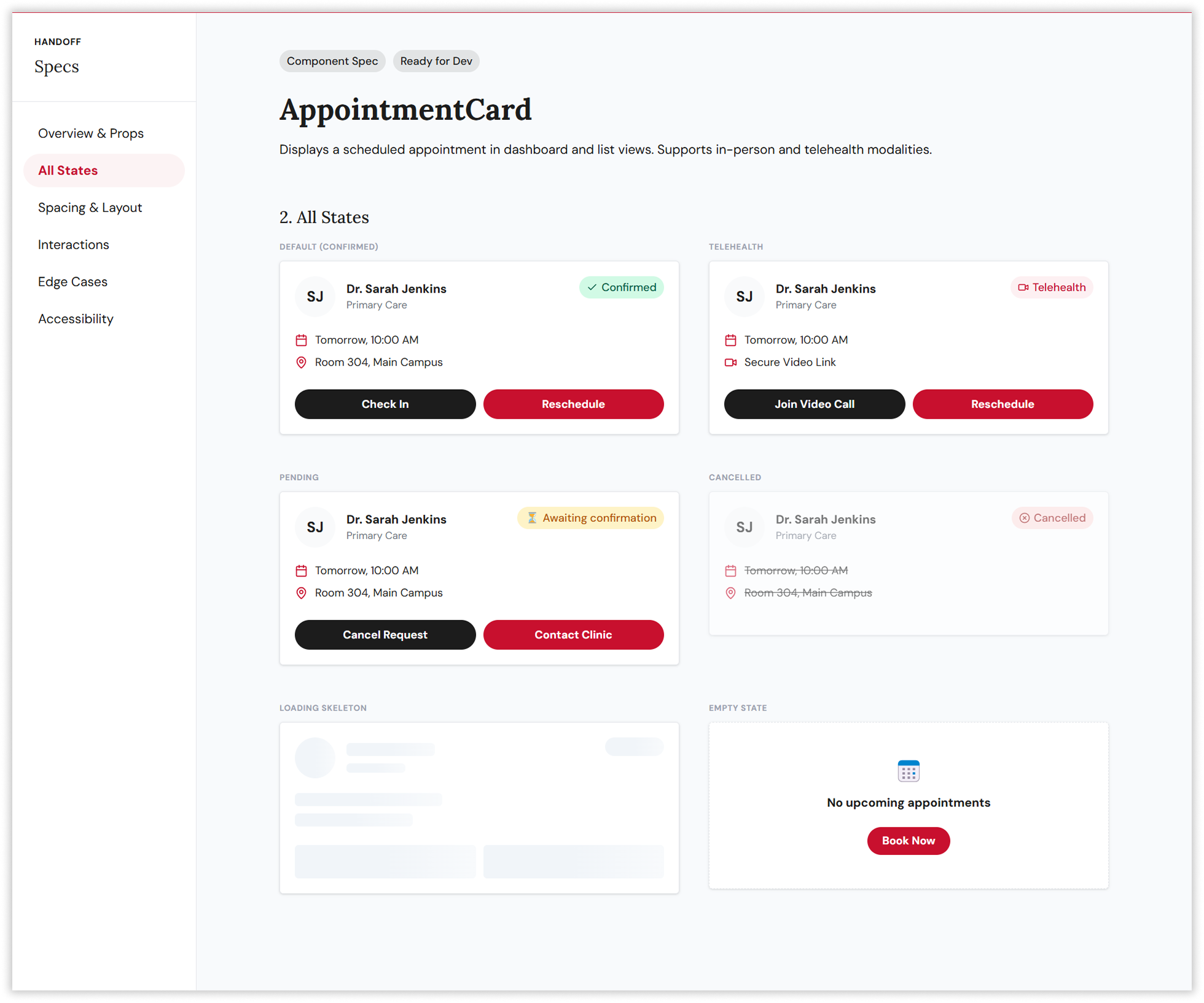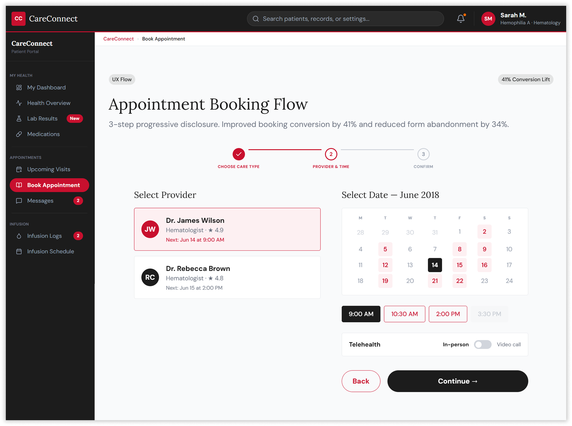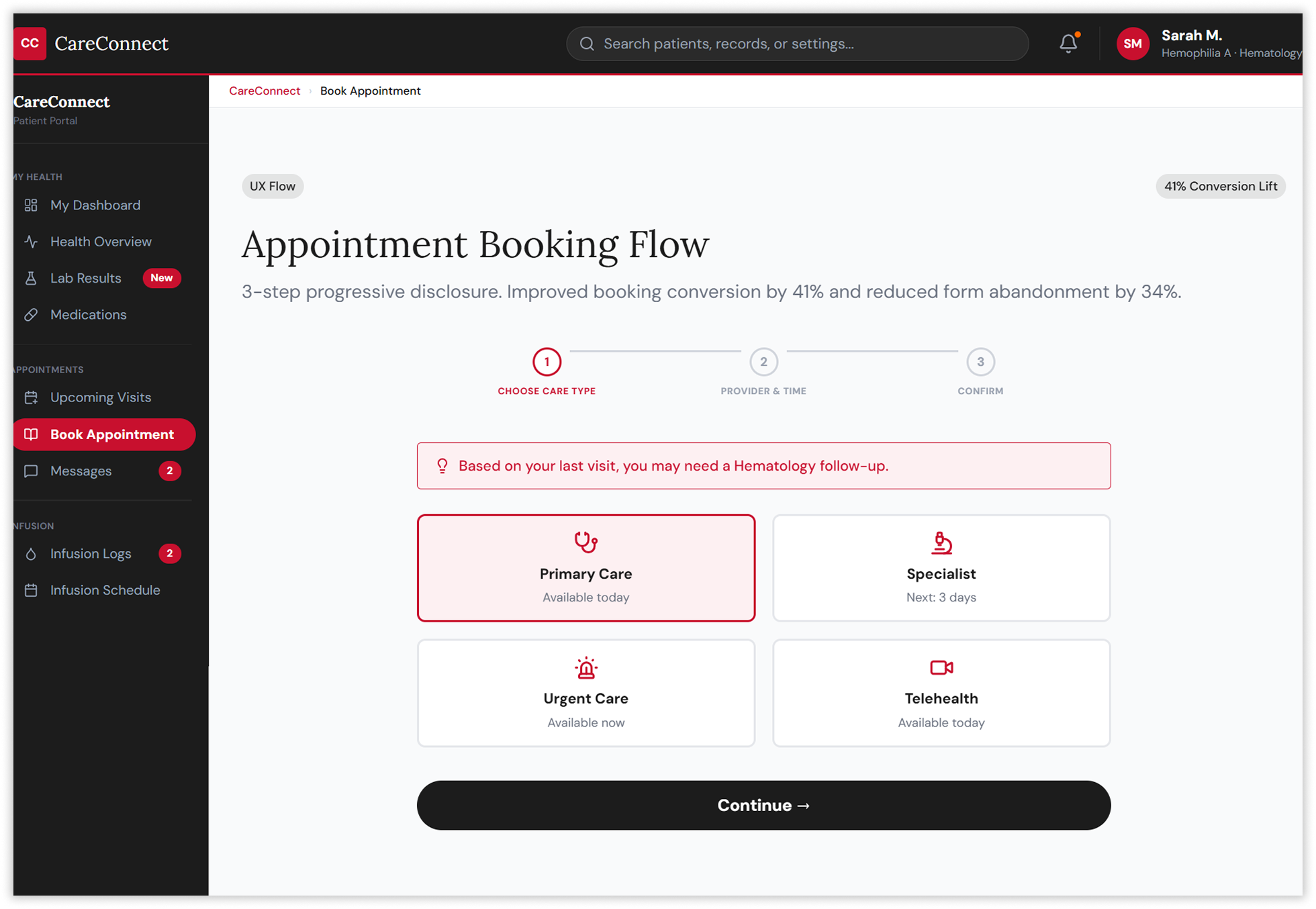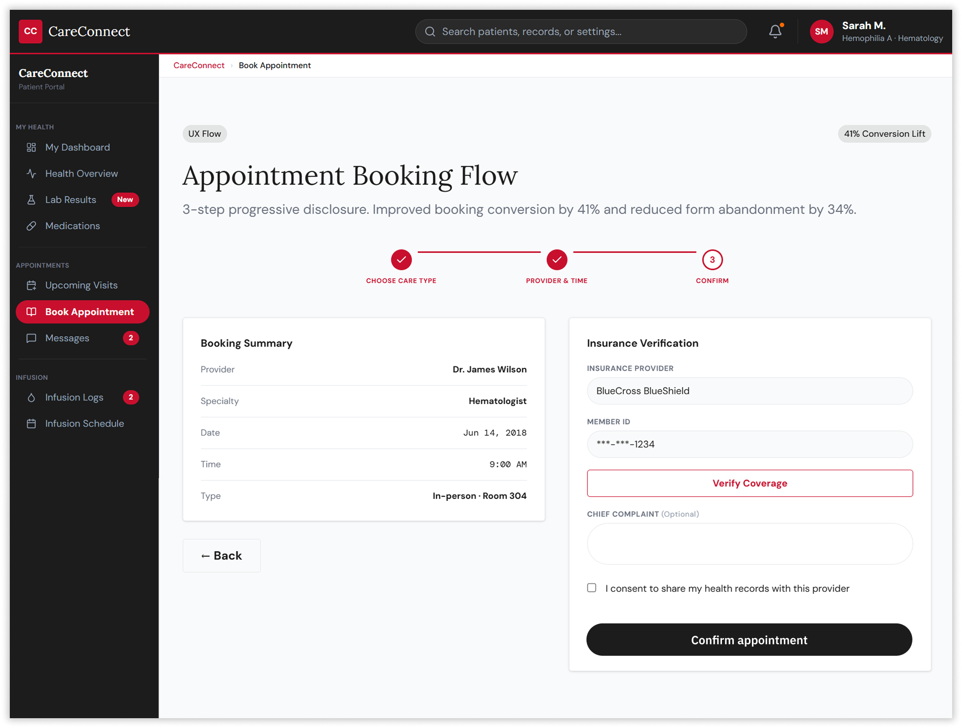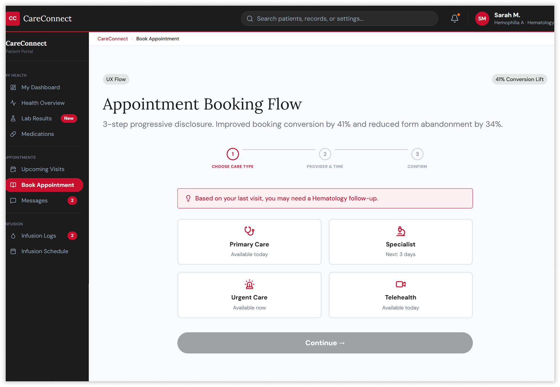 The booking flow was redesigned using three-step progressive disclosure, revealing only what was needed at each stage. Step one asked the patient to choose a care type — and nothing more. The calendar appeared only once a provider was selected. Insurance verification was pre-filled from profile data, requiring only confirmation. Auto-save ran silently throughout, preventing the data loss that had been a primary driver of abandonment.