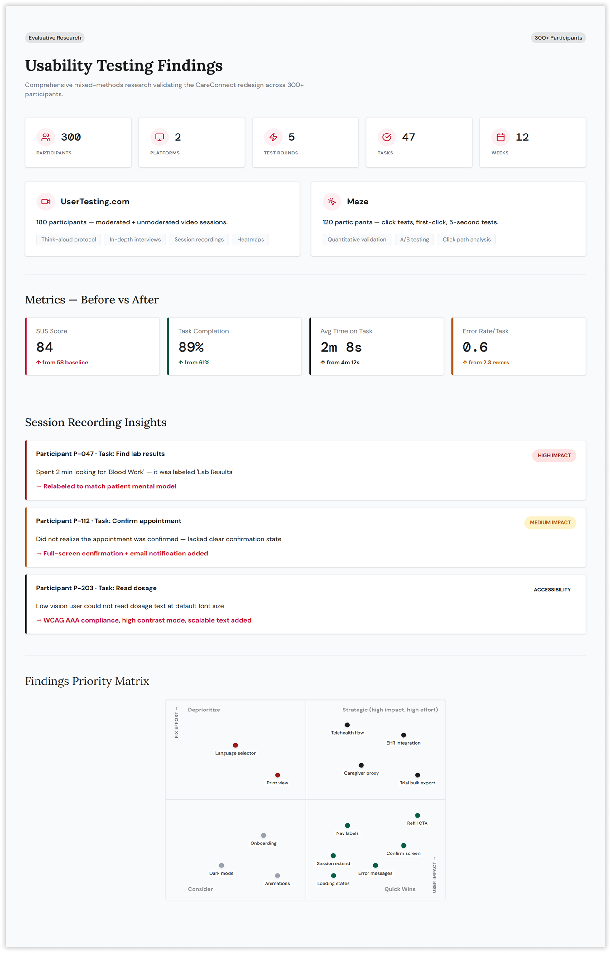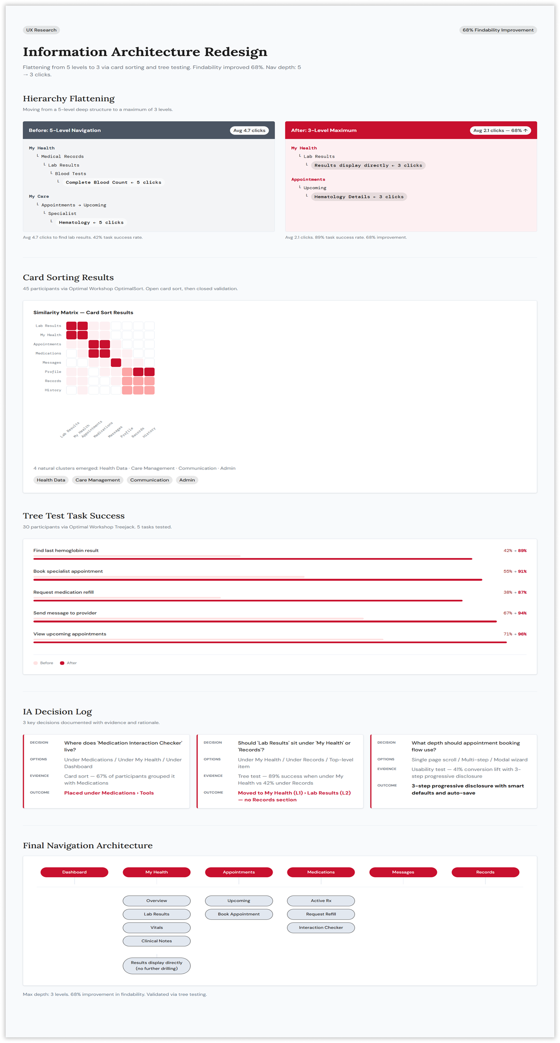 The work also reinforced something I believe deeply about the relationship between research and design: the navigation architecture that improved findability by 68% did not come from design intuition. It came from 75 card-sorting participants telling us, independently, that they expected lab results to live under health information rather than records. The design was the last step, not the first. The facilitator work — running design thinking workshops with clinicians, compliance officers, and patients in the same room, managing the tension between what engineers wanted to build and what patients needed to use — was as important as any wireframe.