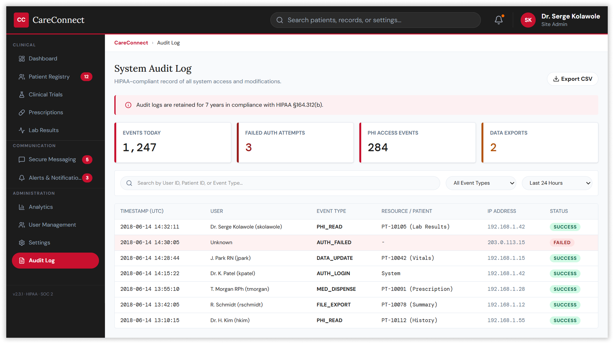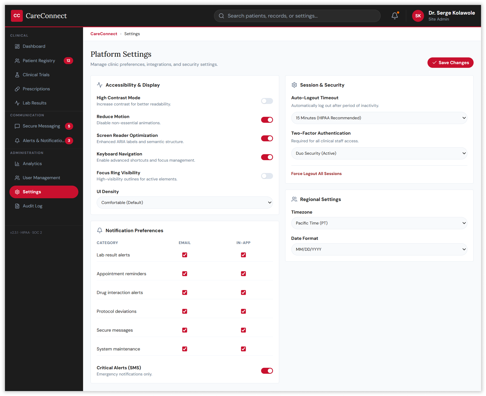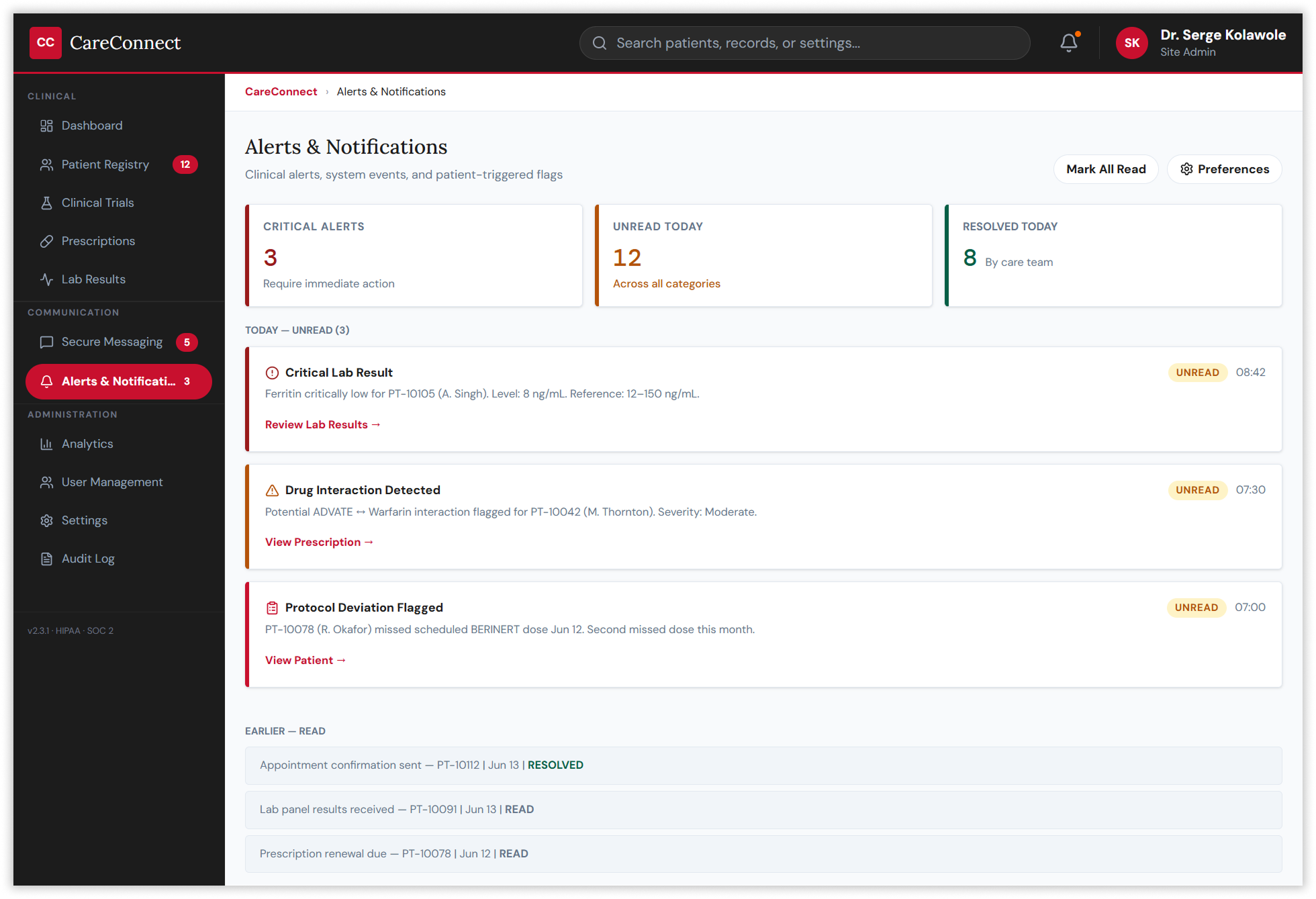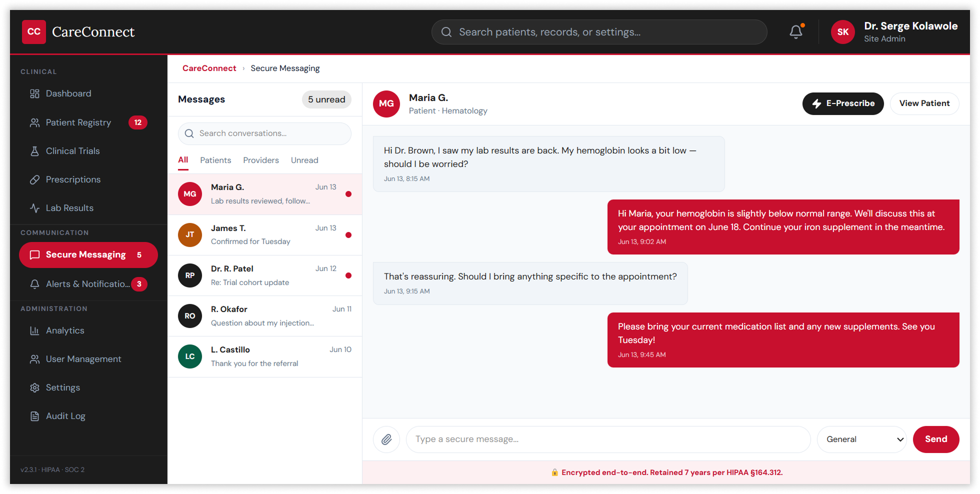 The provider dashboard was designed for the reality of clinical work: high information density, time pressure, and zero tolerance for interface errors when prescribing. The three-column layout — patient queue, EHR detail panel, and quick actions — kept everything within reach without requiring navigation. The SOAP note editor supported clinical shorthand expansion. The e-prescribe modal flagged drug interactions with documented severity levels and required override justification before submission. The secure messaging centre, built with HIPAA-compliant encryption and seven-year retention, provided a dedicated clinical communication channel between providers and patients with message type classification for urgency triage.