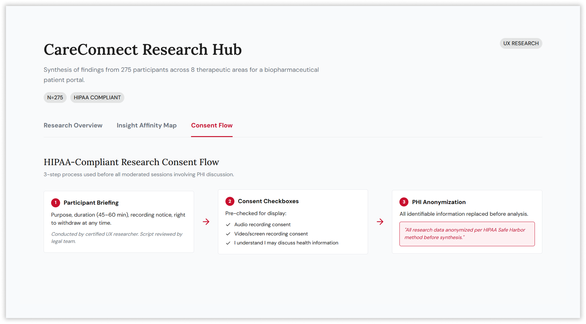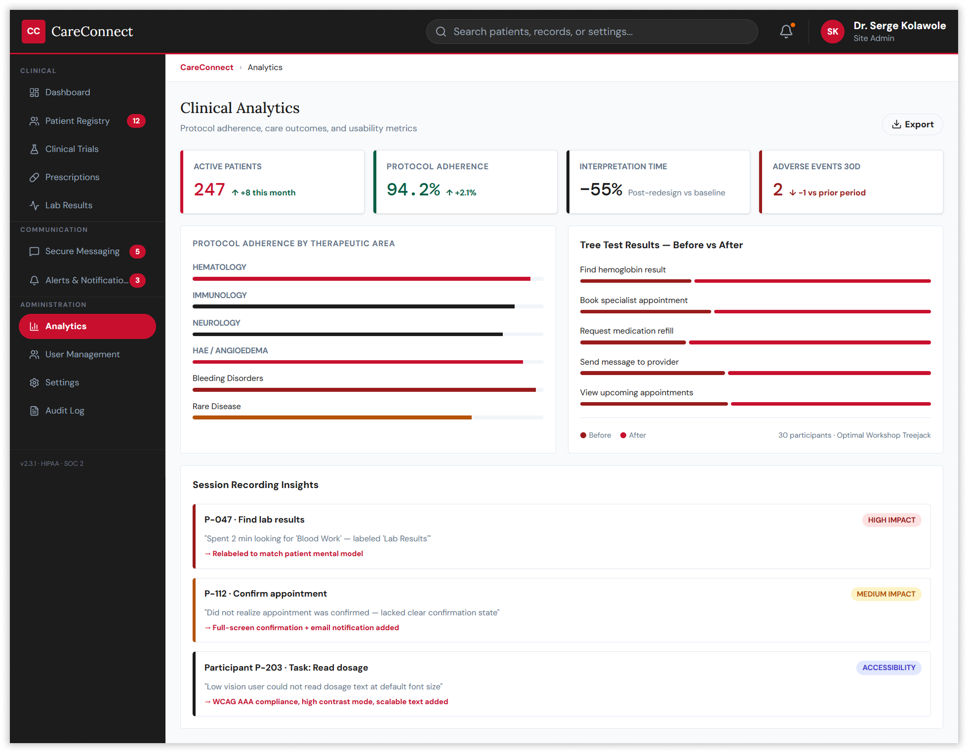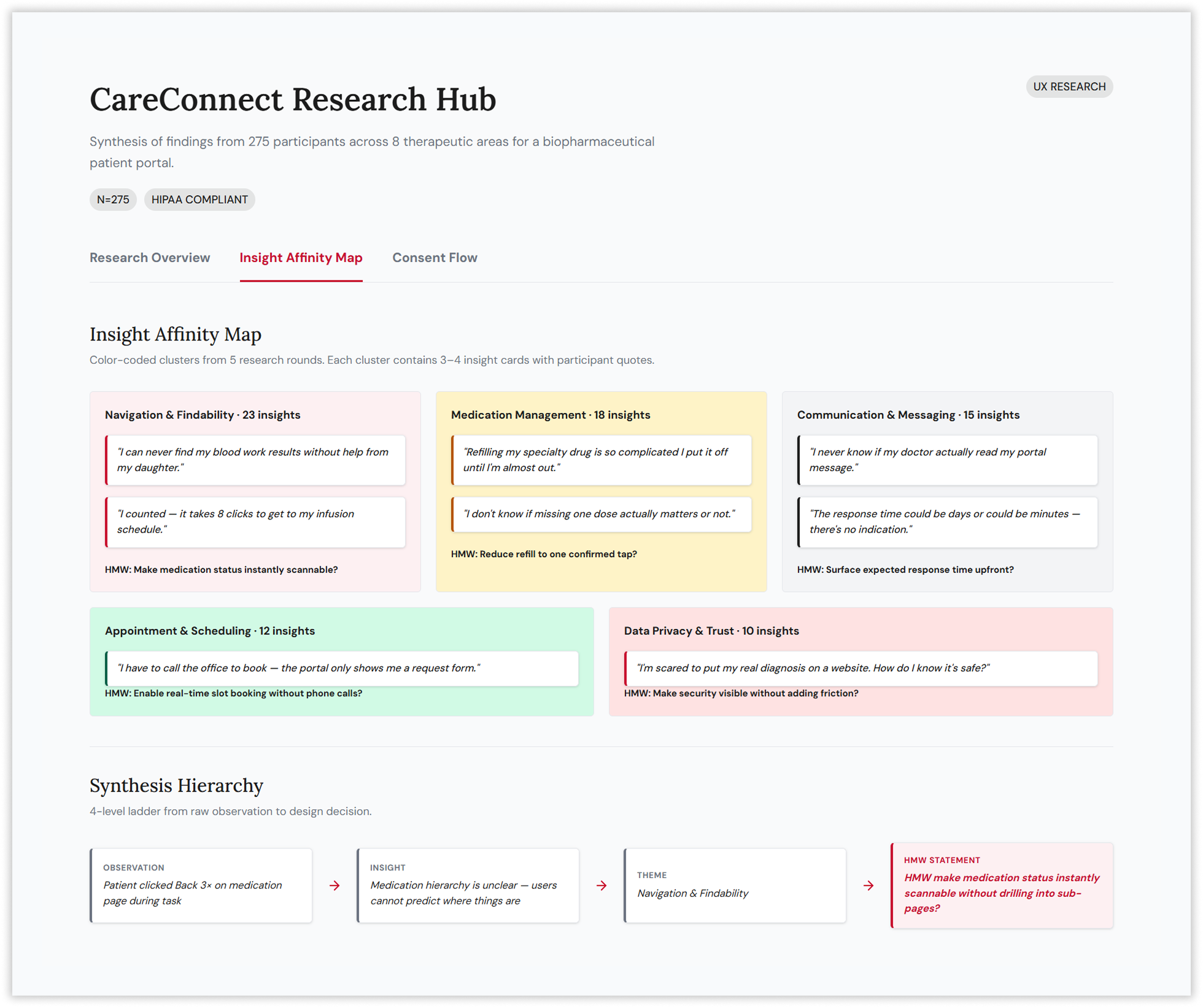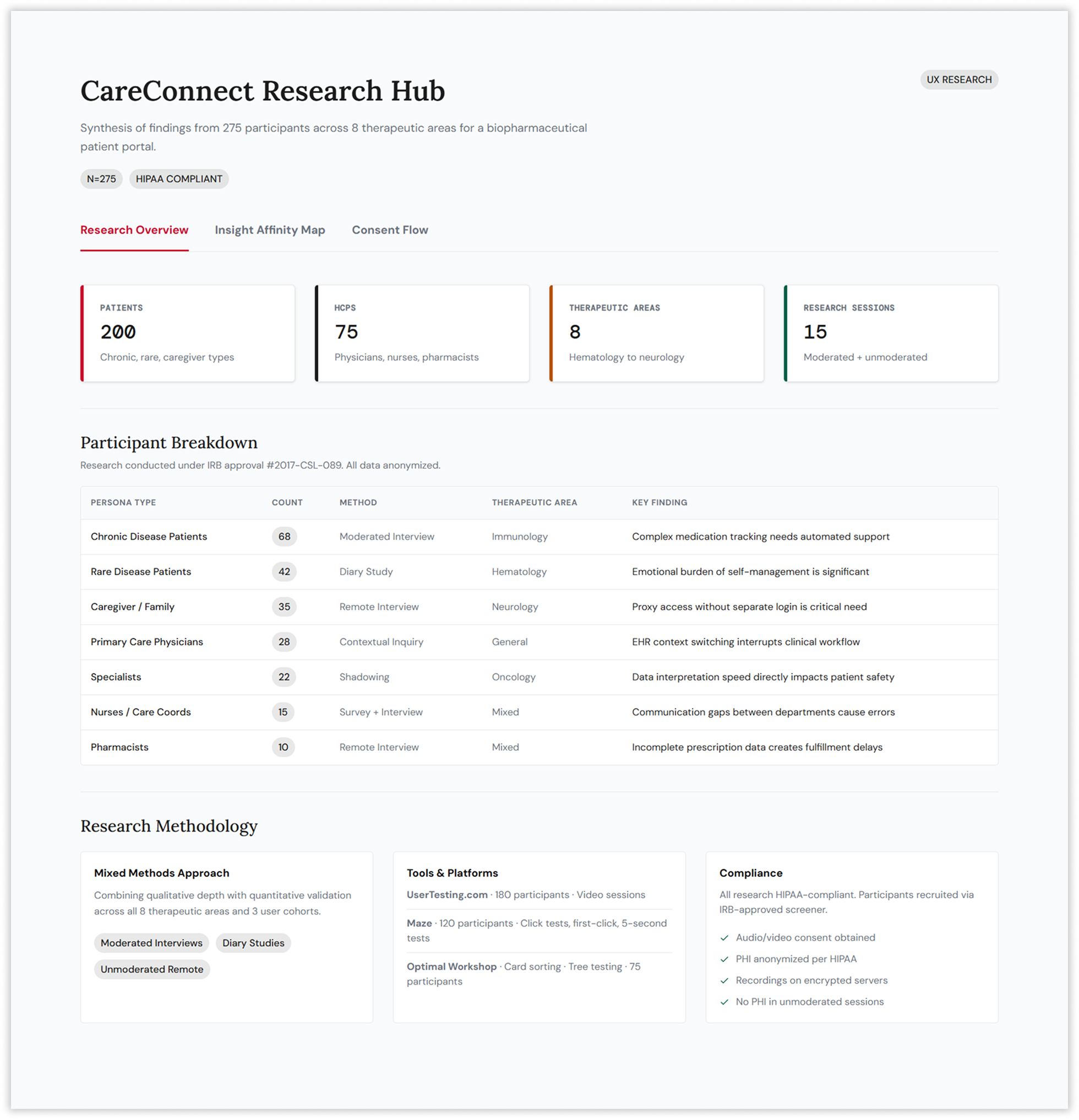 The strategy began with a comprehensive research programme spanning 200 patients and 75 healthcare professionals across eight therapeutic areas. Conducted under IRB approval and HIPAA Safe Harbor compliance, the research combined moderated interviews, diary studies, contextual inquiry, and remote unmoderated sessions to map the full landscape of user needs. Participants included chronic disease patients, rare disease patients, caregivers managing proxy access, primary care physicians frustrated by duplicate data entry, specialists demanding faster clinical data access, and research coordinators needing bulk export tools for 40-patient trial cohorts.