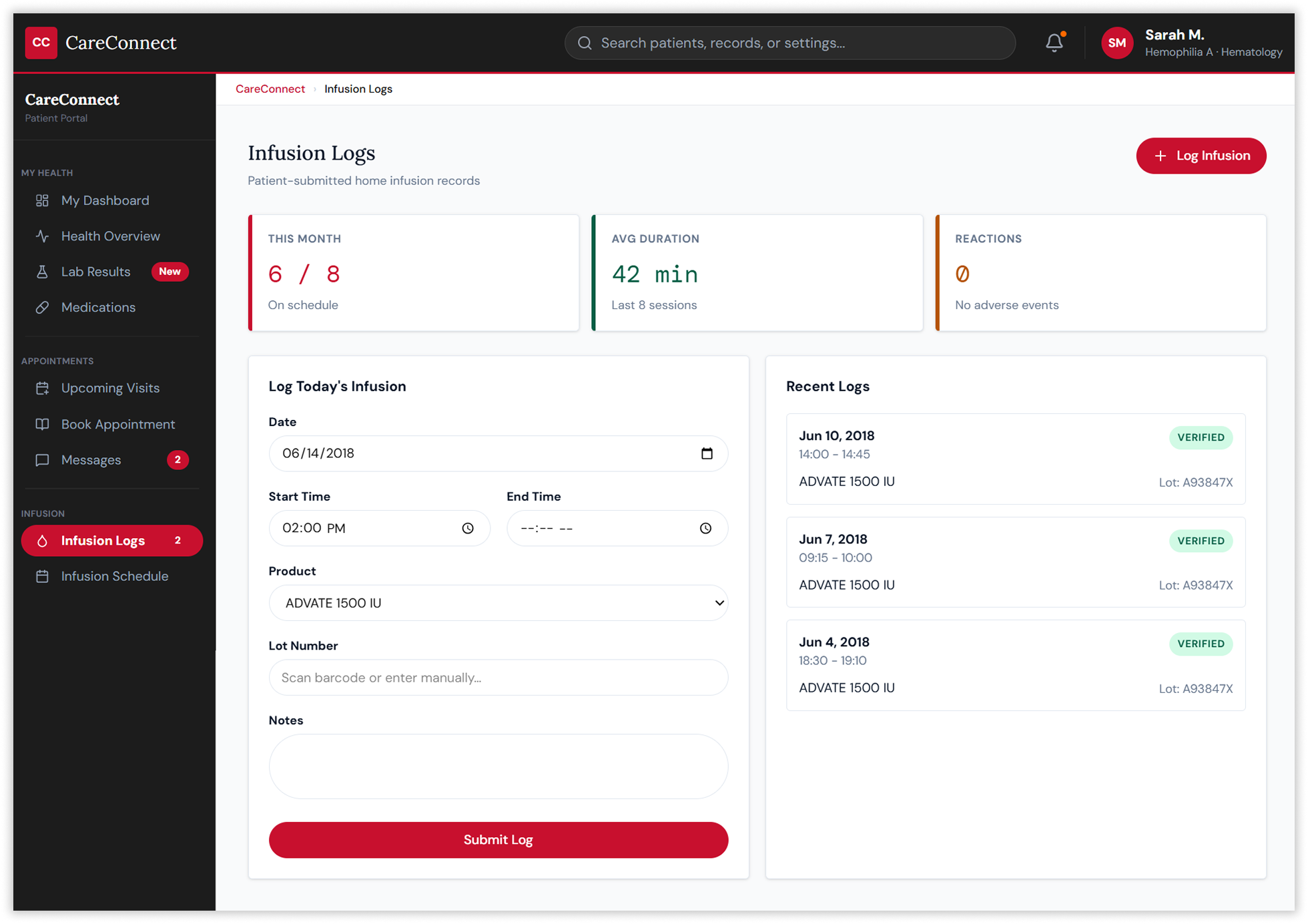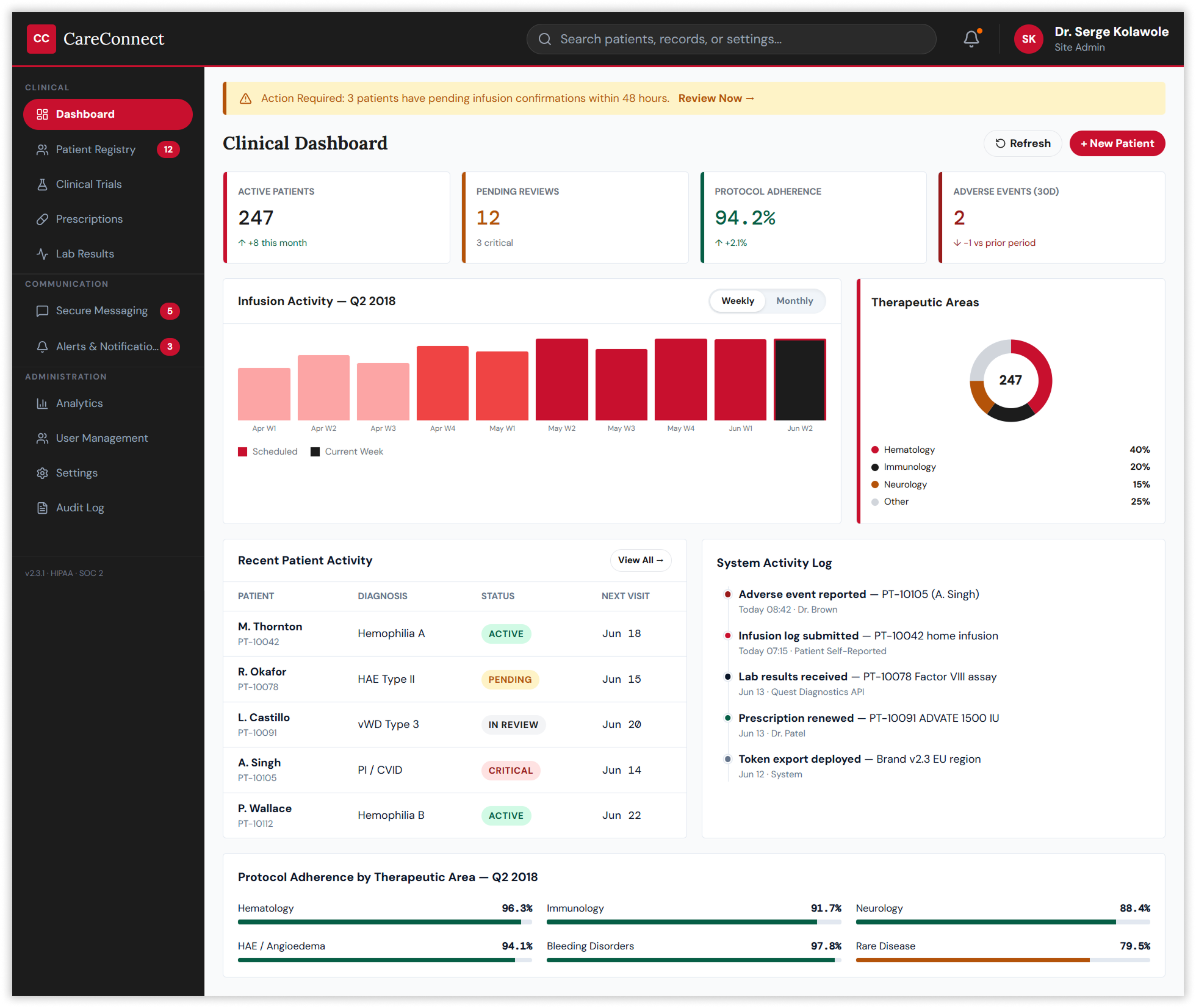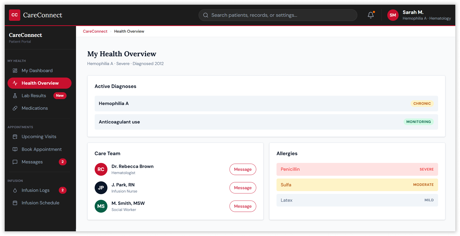 CSL Behring is one of the world’s leading biopharmaceutical companies, specialising in rare and serious diseases including haemophilia, hereditary angioedema, and primary immunodeficiency. The platform — CareConnect — was built to serve a uniquely high-stakes population: patients who self-administer intravenous infusions at home, track complex laboratory values, and depend on uninterrupted access to their care team for clinical guidance that directly affects their health outcomes.