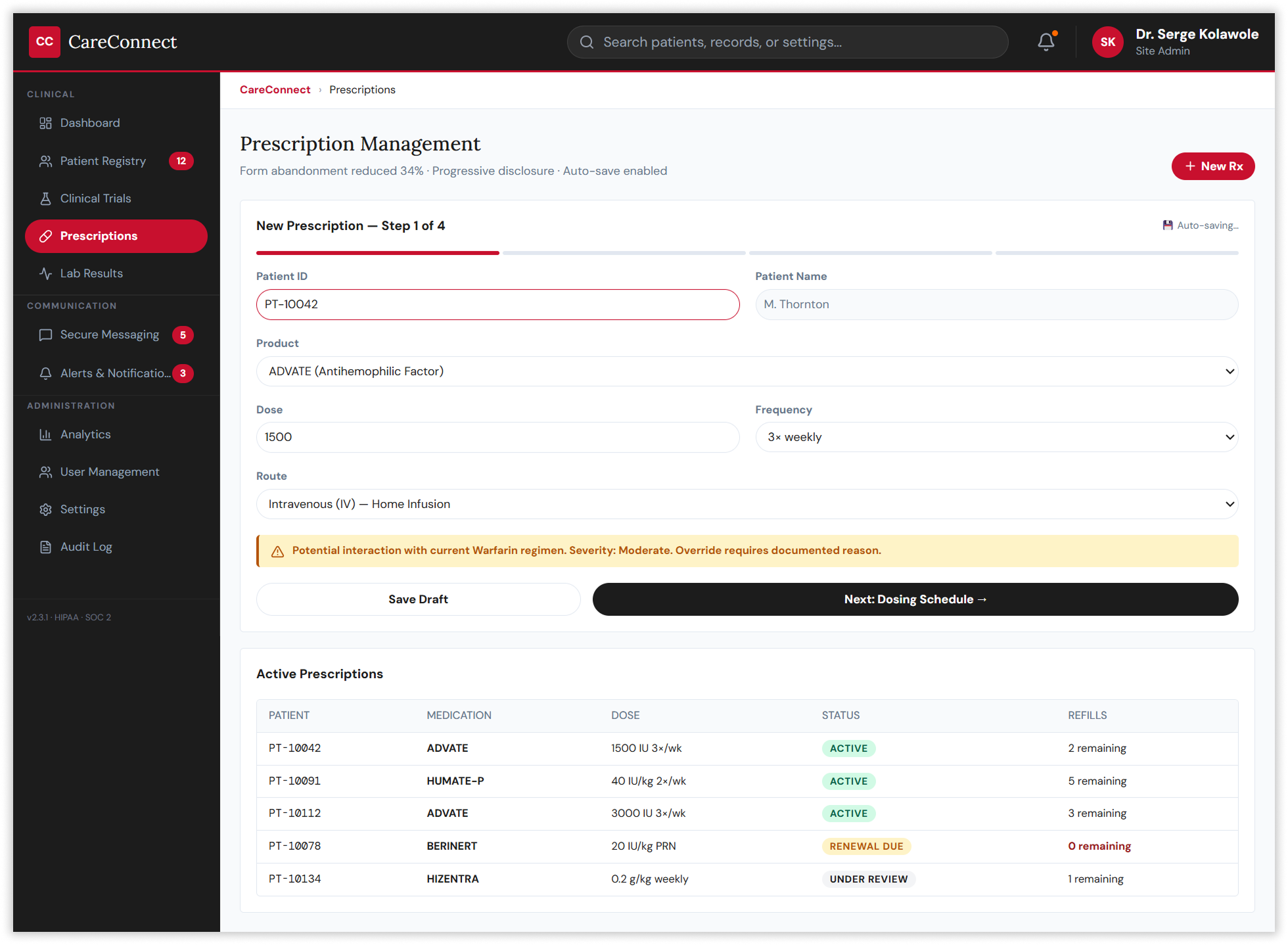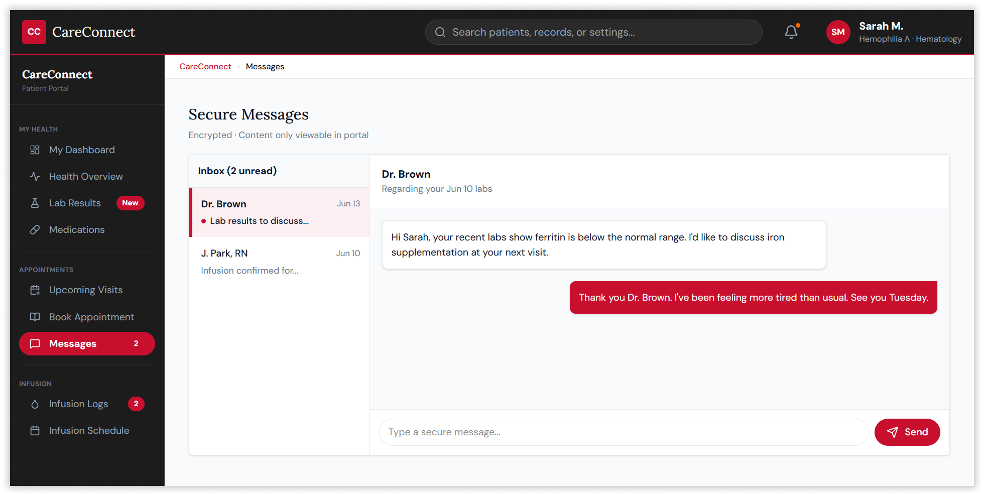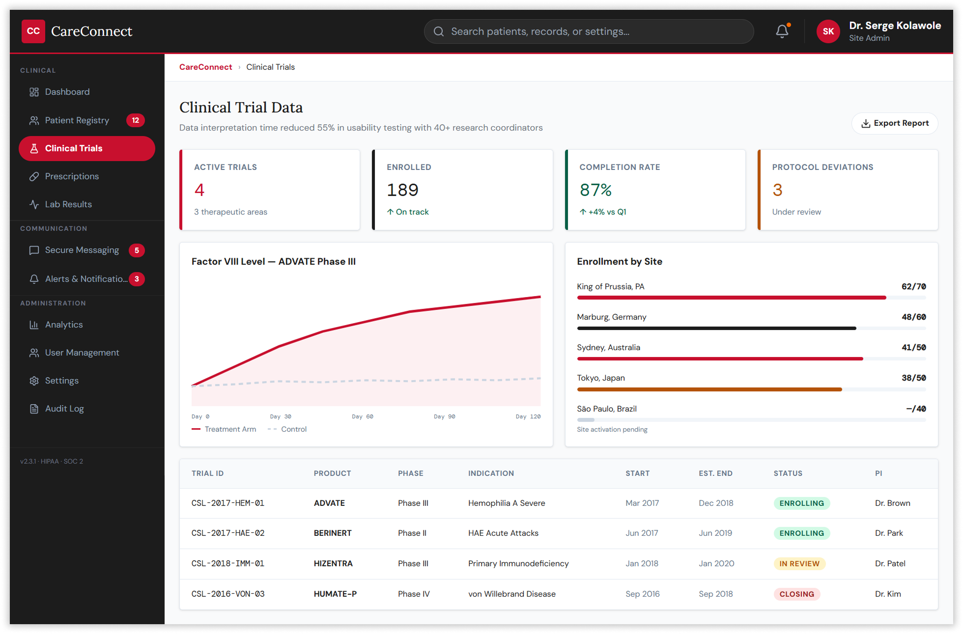 CSL Behring is one of the world’s leading biopharmaceutical companies, specialising in rare and serious diseases including haemophilia, hereditary angioedema, and primary immunodeficiency. The platform — CareConnect — was built to serve a uniquely high-stakes population: patients who self-administer intravenous infusions at home, track complex laboratory values, and depend on uninterrupted access to their care team for clinical guidance that directly affects their health outcomes.