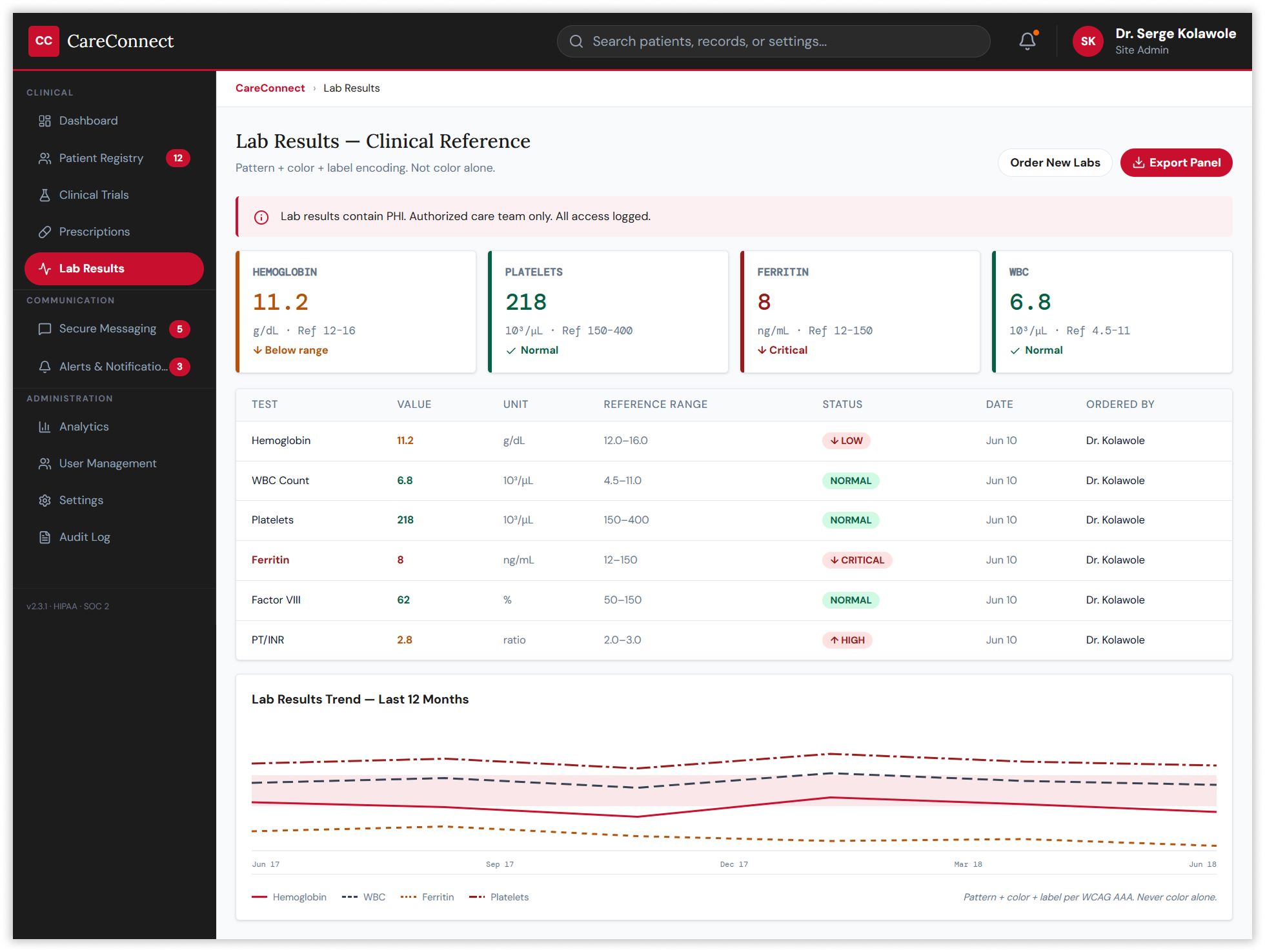 The medication tracker used a weekly grid with clear taken, missed, and upcoming states. Lab results were encoded using pattern, colour, and label simultaneously — never colour alone — meeting WCAG 2.1 Level AAA compliance standards that made the platform usable for Marcus and users with visual impairments alike.