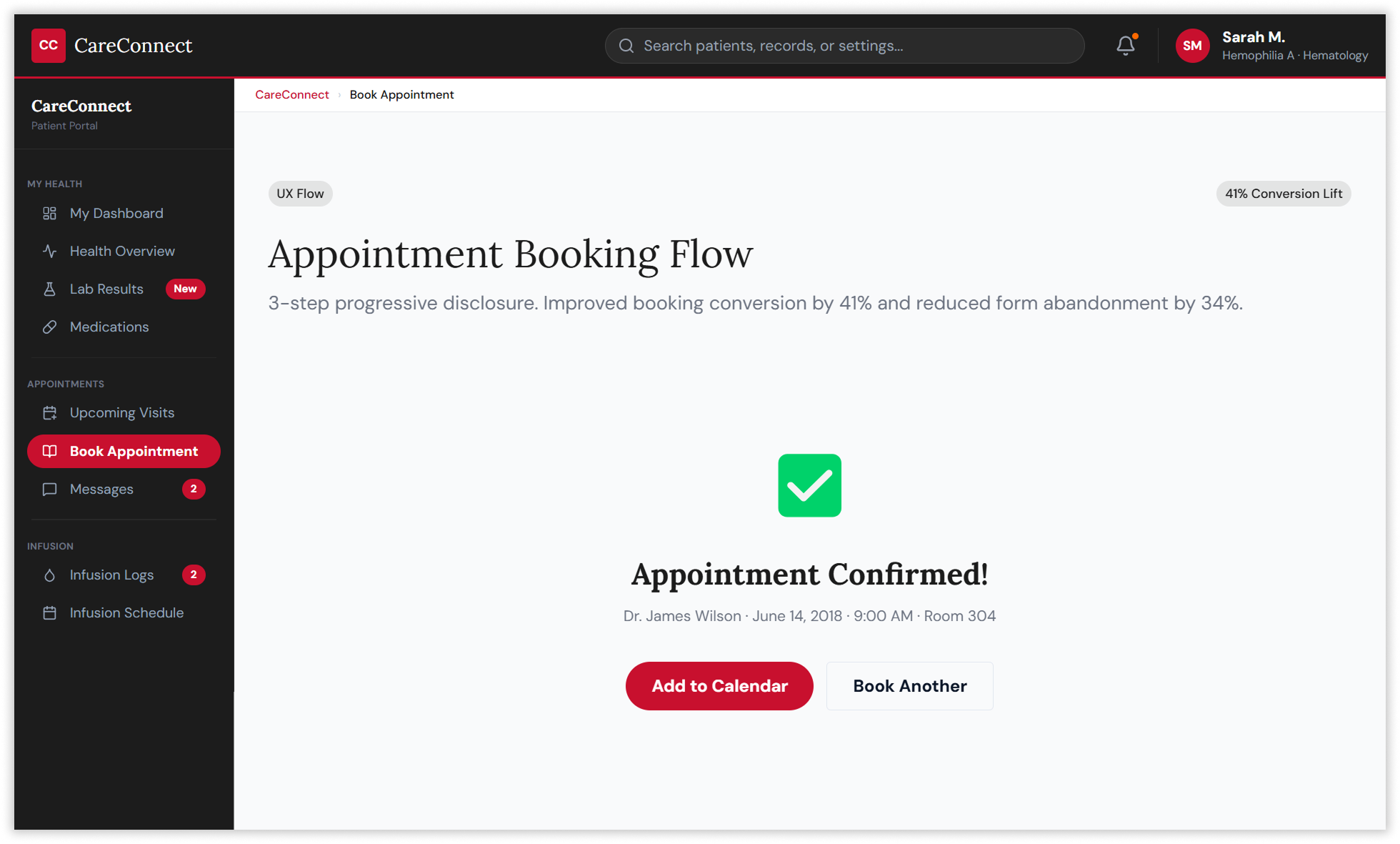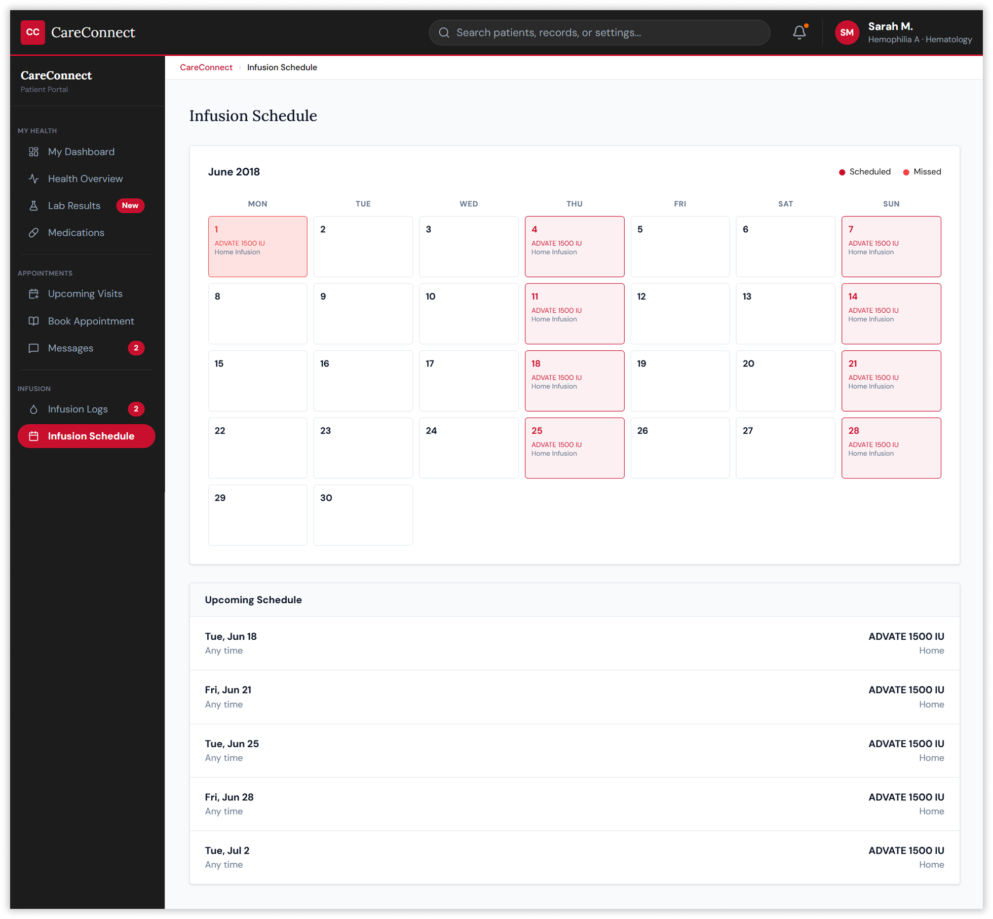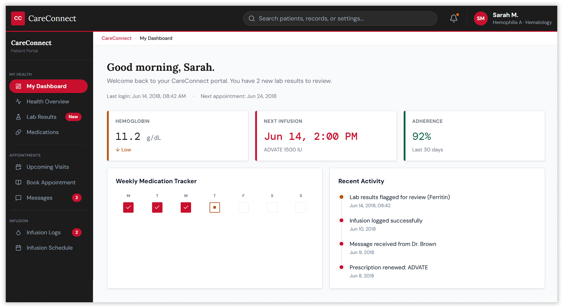 The patient-facing portal was designed around a single governing principle: every person using this product is managing something serious, and the design must reduce cognitive load, not add to it. The dashboard greeted Sarah by name, surfaced her haemoglobin reading with a clear amber indicator and reference range, showed her next infusion in three words, and displayed her monthly adherence at a glance — all before she had scrolled.