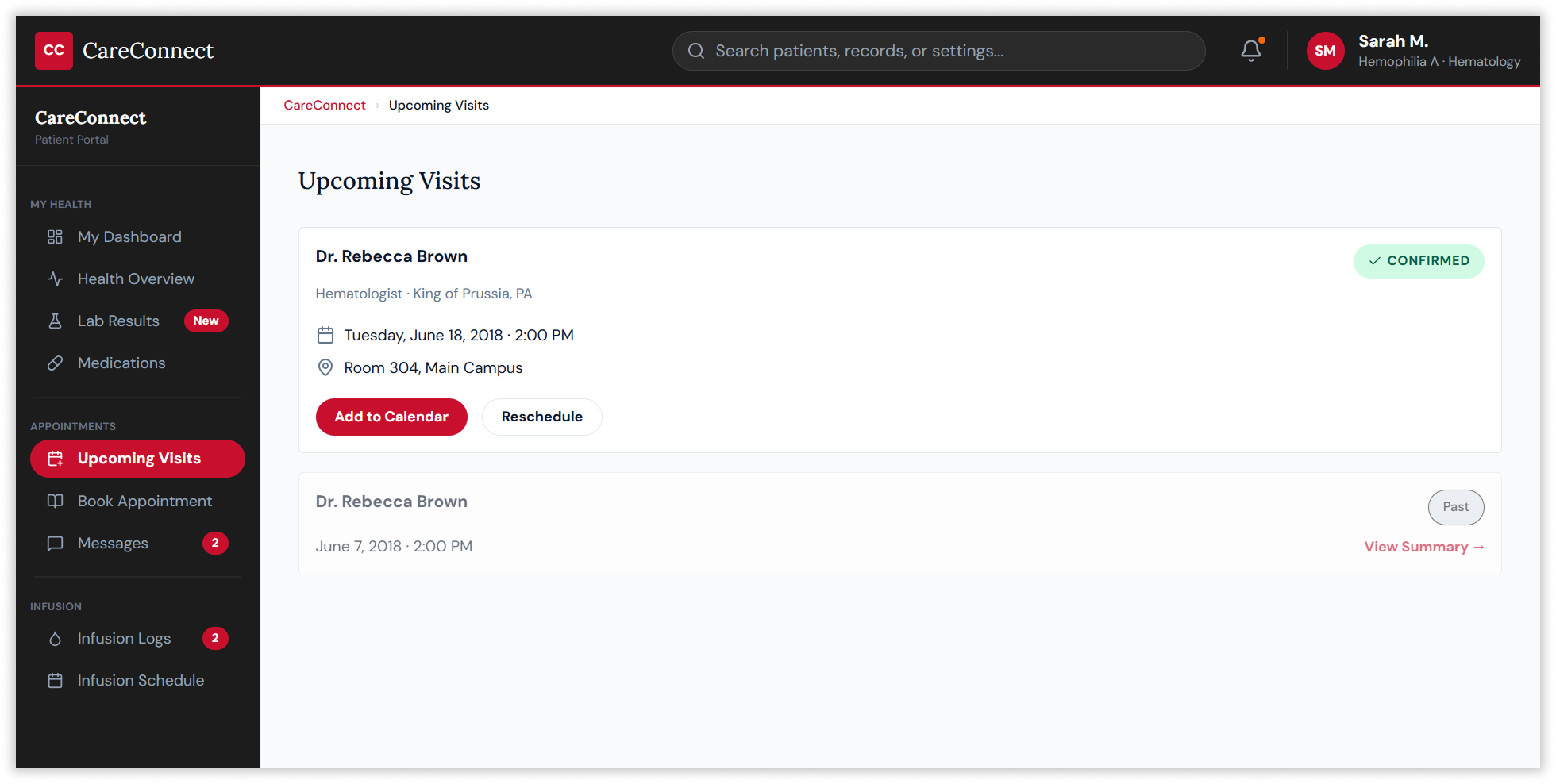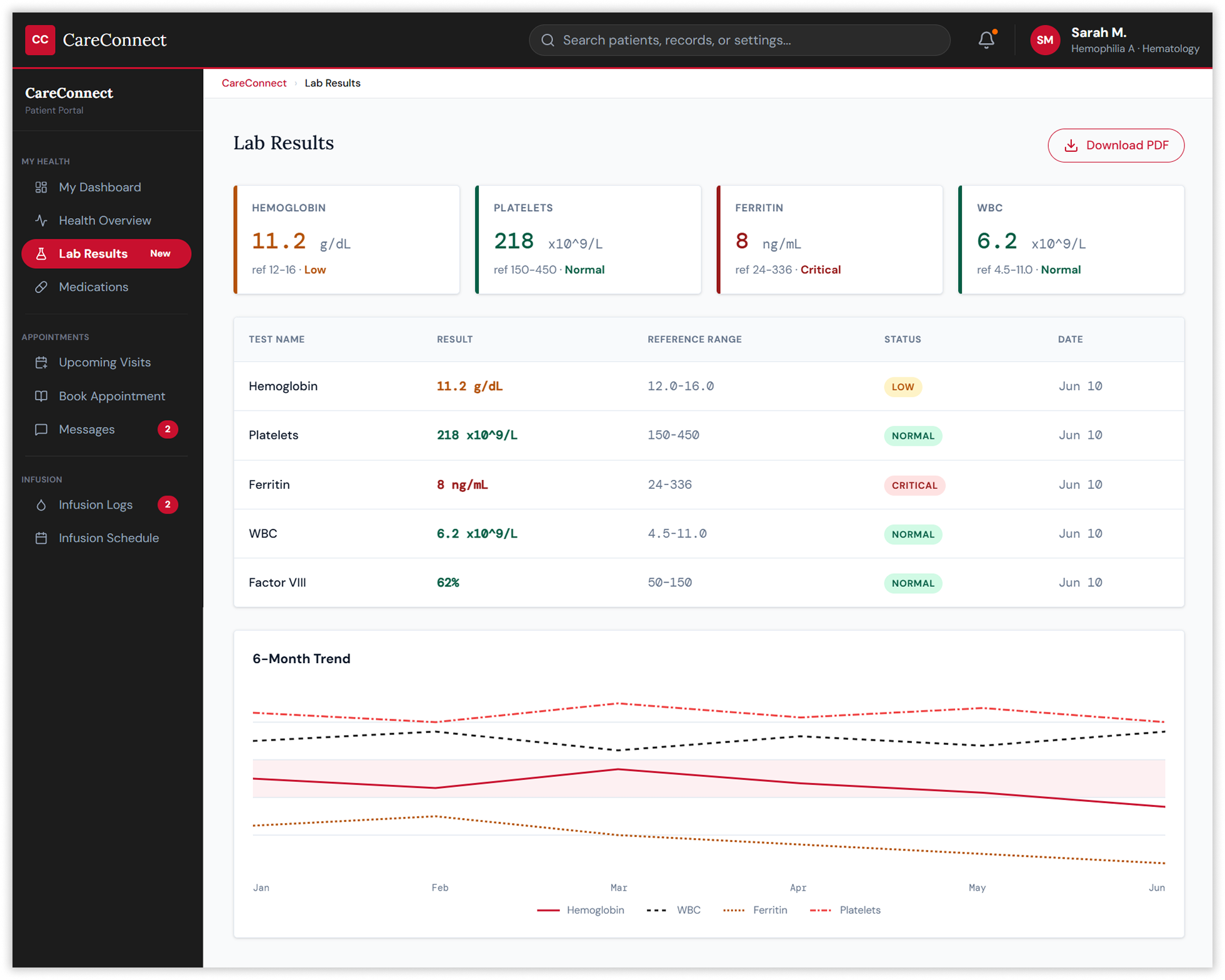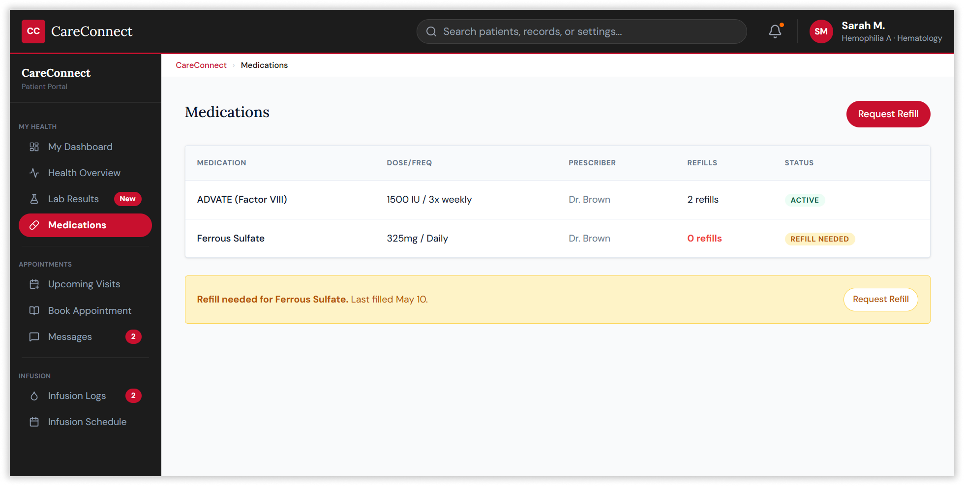The patient-facing portal was designed around a single governing principle: every person using this product is managing something serious, and the design must reduce cognitive load, not add to it. The dashboard greeted Sarah by name, surfaced her haemoglobin reading with a clear amber indicator and reference range, showed her next infusion in three words, and displayed her monthly adherence at a glance — all before she had scrolled.